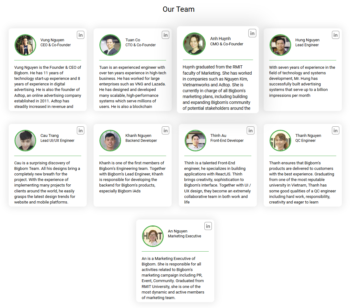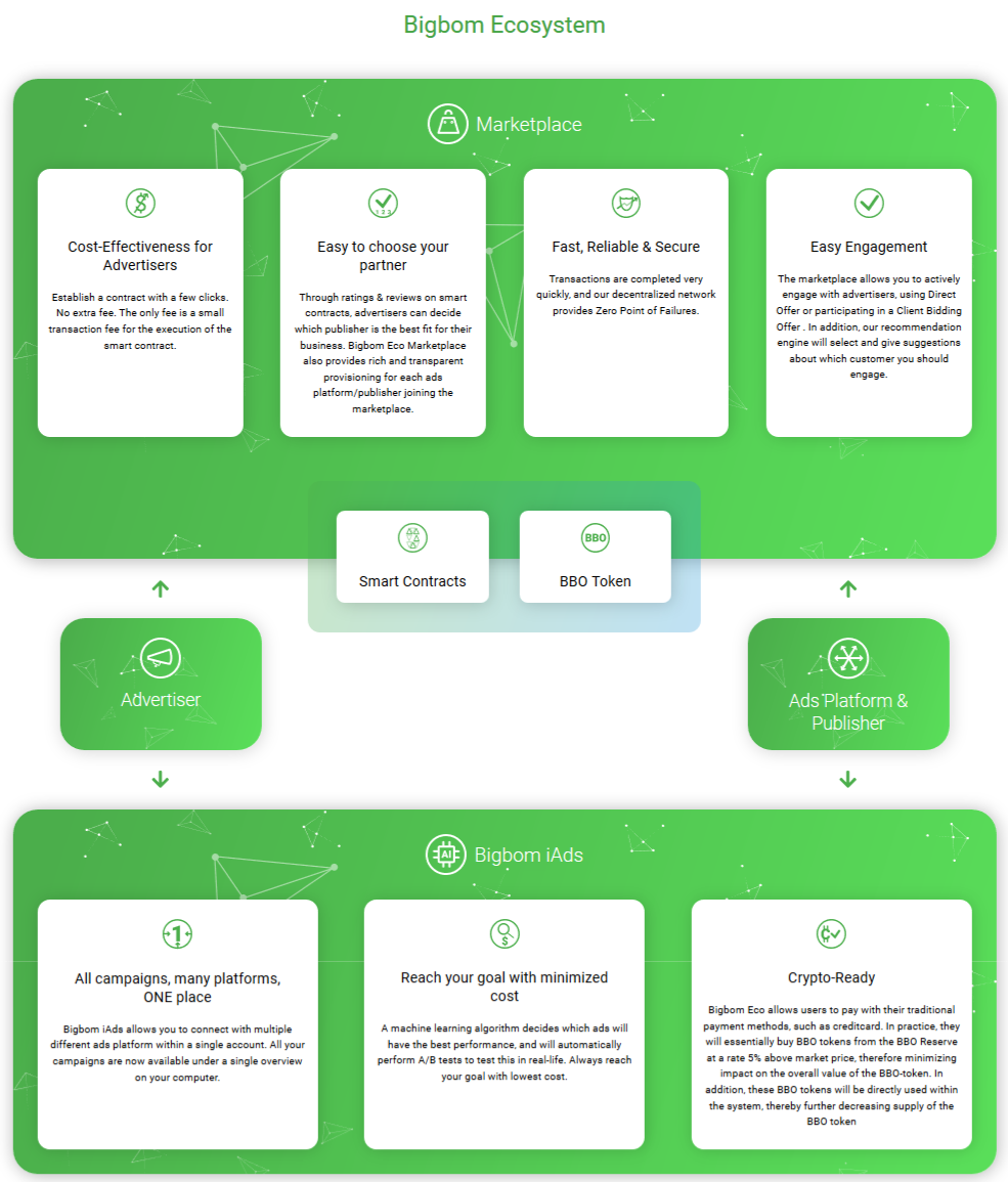 “Bigbom Eco is the first digital advertising ecosystem built as a decentralized application platform (DApp), which links ad platforms and publishers to advertisers globally. We aim to solve the trouble of truth between advertising buyers and sellers by using blockchain technology. We aim to free up human resources in online marketing optimize costs and increase the effect of advertising campaigns through the development of Bigbom iAds, an advertising automation utility which abilities to self-learning and optimizing ads bidding on many popular platforms.”