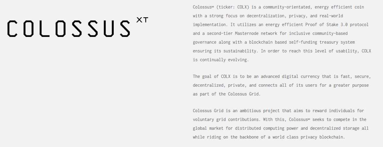 “Colossus Grid is an ambitious project that aims to reward individuals for voluntary grid contributions. With this, ColossusXT seeks to compete in the global market for distributed computing power and decentralized storage all while riding on the backbone of a world class privacy blockchain.”
