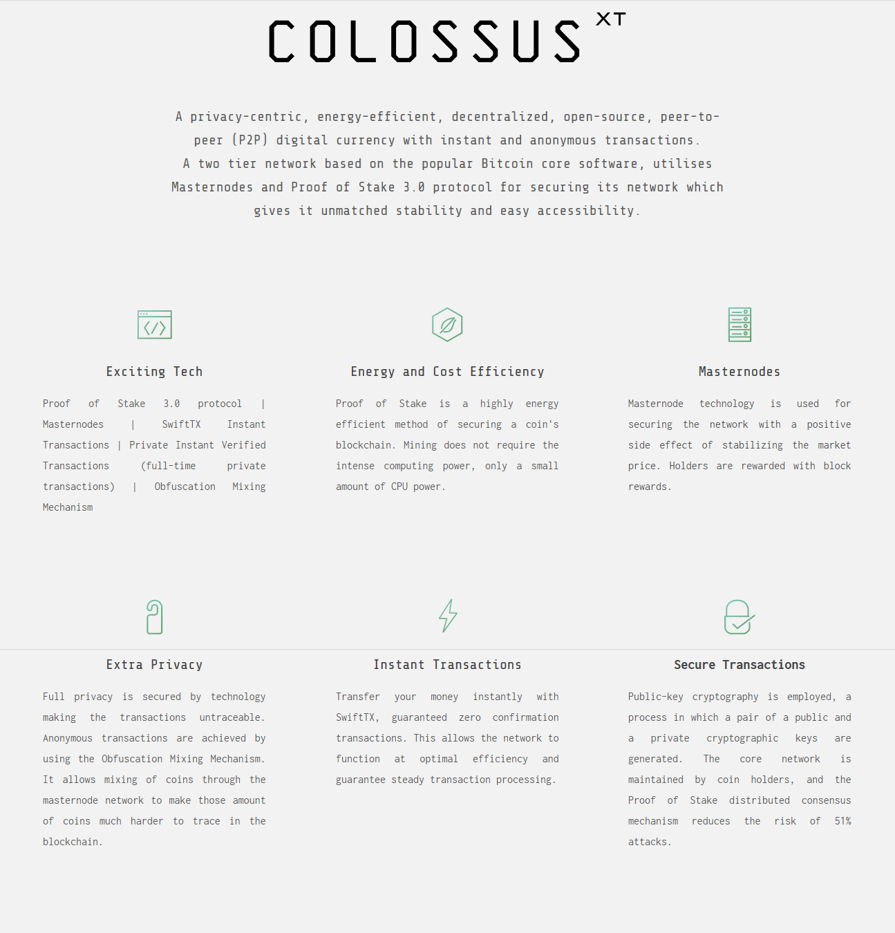 ColossusXT (ticker: COLX) is a community-orientated, energy efficient coin with a strong focus on decentralization, privacy, and real-world implementation. It utilizes an energy efficient Proof of Stake 3.0 protocol and a second-tier Masternode network for inclusive community-based governance along with a blockchain based self-funding treasury system ensuring its sustainability. In order to reach this level of usability, ColossusXT is continually evolving.