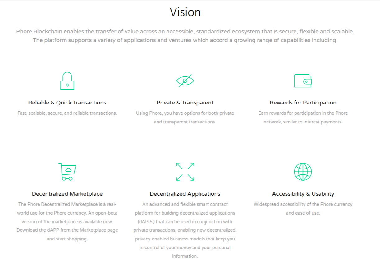 “Phore Blockchain will provide a robust, secure, private, and completely decentralized network underpinned by the Phore cryptocurrency, PHR. It will consist of a thriving ecosystem of privacy-enabled decentralized applications and a marketplace that will provide real world applications to enable private commerce and new privacy-enabled business models. No permissions will be required to utilize PHR or its applications as there is no centralized authority behind them. Applications and improvements to the Phore Blockchain core code will be made by the Phore Blockchain community. Phore is money on your terms.”