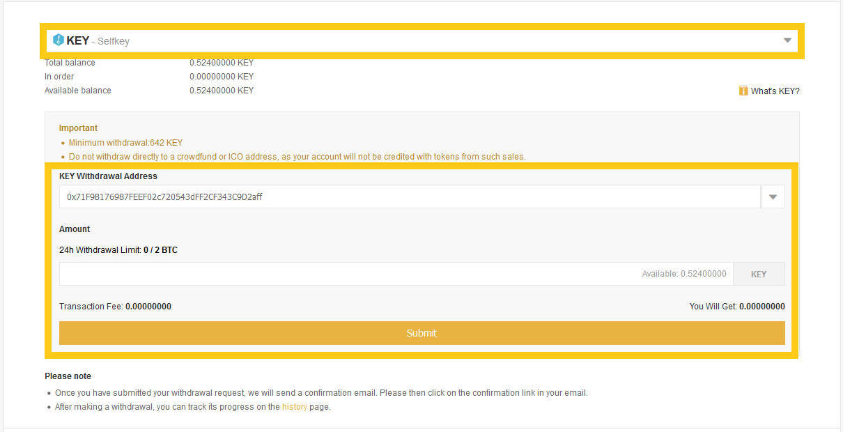 Locate SelfKey (KEY) by using the drop-down box provided. Enter the amount of KEY you’d like to withdraw taking into account the fees/minimums shown and make sure the withdraw address you have entered is yours and is correct.