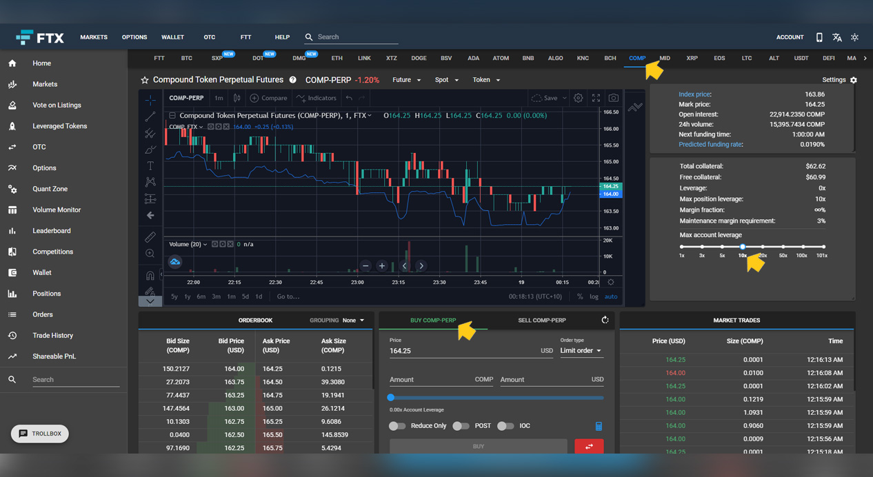 In order to long or short COMP, you’ll need to Sign Up to FTX Exchange. FTX is a cryptocurrency derivatives exchange built by traders, for traders. They’ve built a platform powerful enough for professional trading firms and intuitive enough for first-time users. FTX allows you to go long or short on Compound (COMP) with up to 101x leverage. FTX boasts over 40 perpetual contracts and is constantly adding more pairs like COMP via community votes and by keeping a close eye on what Traders want to trade. There’s no need to verify your KYC details unless you wish to withdraw over $1,000 USD per day.
