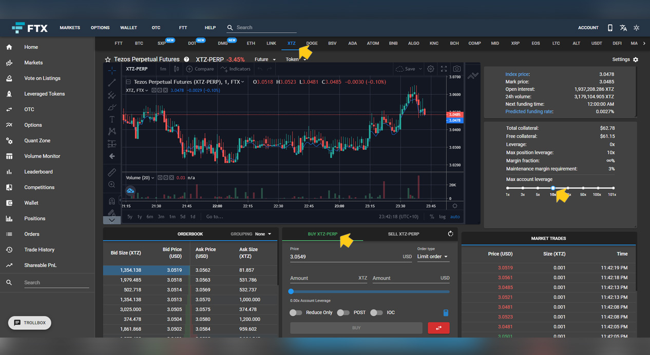 In order to long or short XTZ, you’ll need to Sign Up to FTX Exchange. FTX is a cryptocurrency derivatives exchange built by traders, for traders. They’ve built a platform powerful enough for professional trading firms and intuitive enough for first-time users. FTX allows you to go long or short on Tezos (XTZ) with up to 101x leverage. FTX boasts over 40 perpetual contracts and is constantly adding more pairs like XTZ via community votes and by keeping a close eye on what Traders want to trade. There’s no need to verify your KYC details unless you wish to withdraw over $1,000 USD per day.